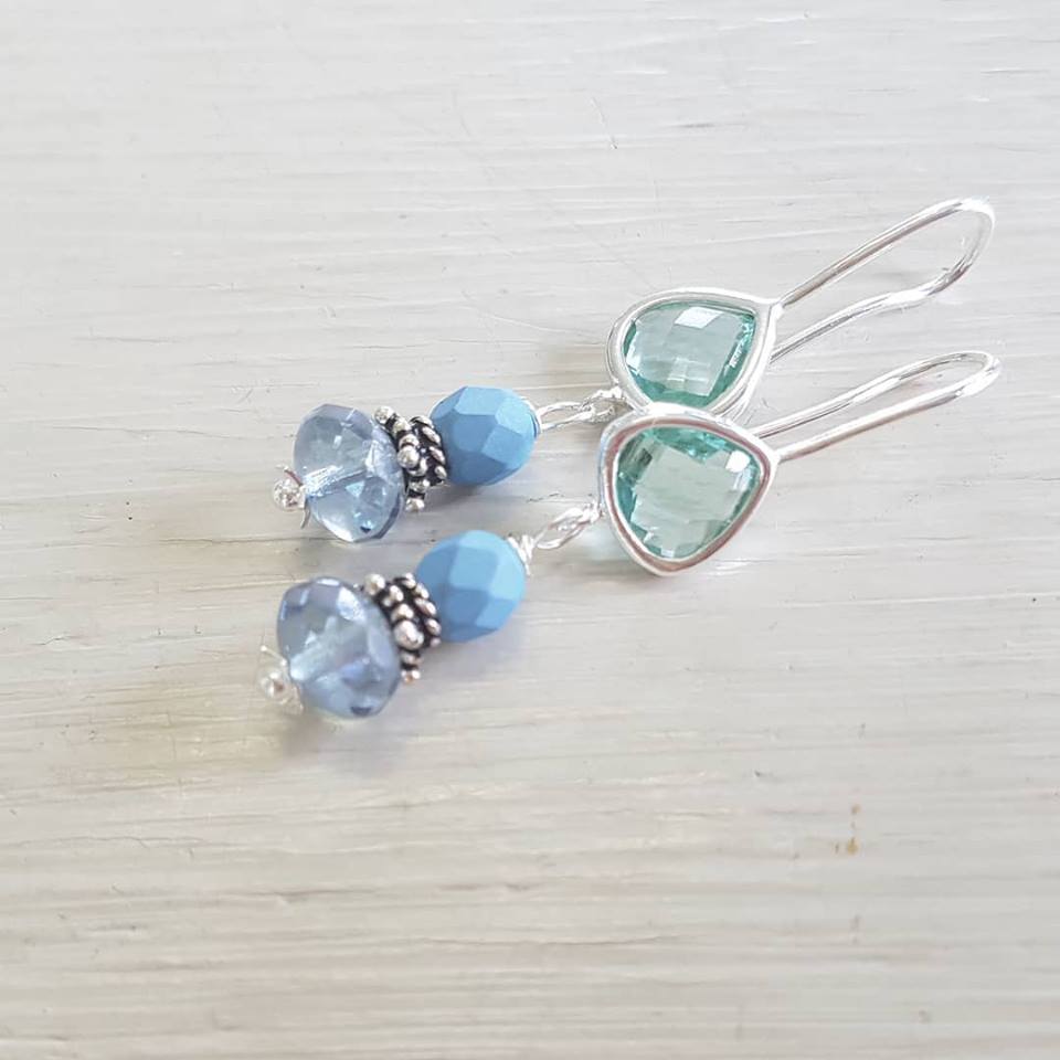 Silberne Ohrhänger mit Aquamarinblauen Glasperlen und facettierten Steinen